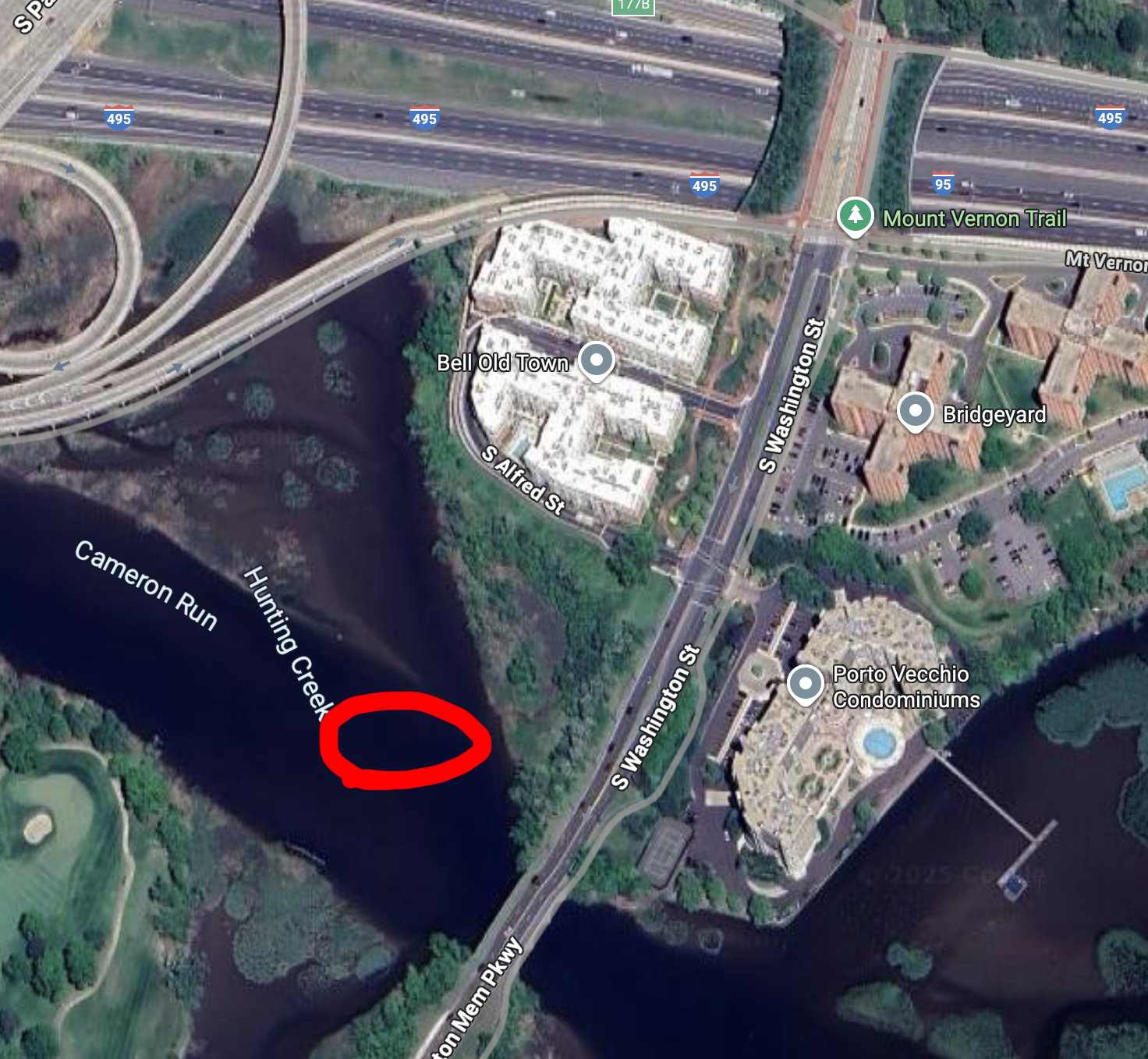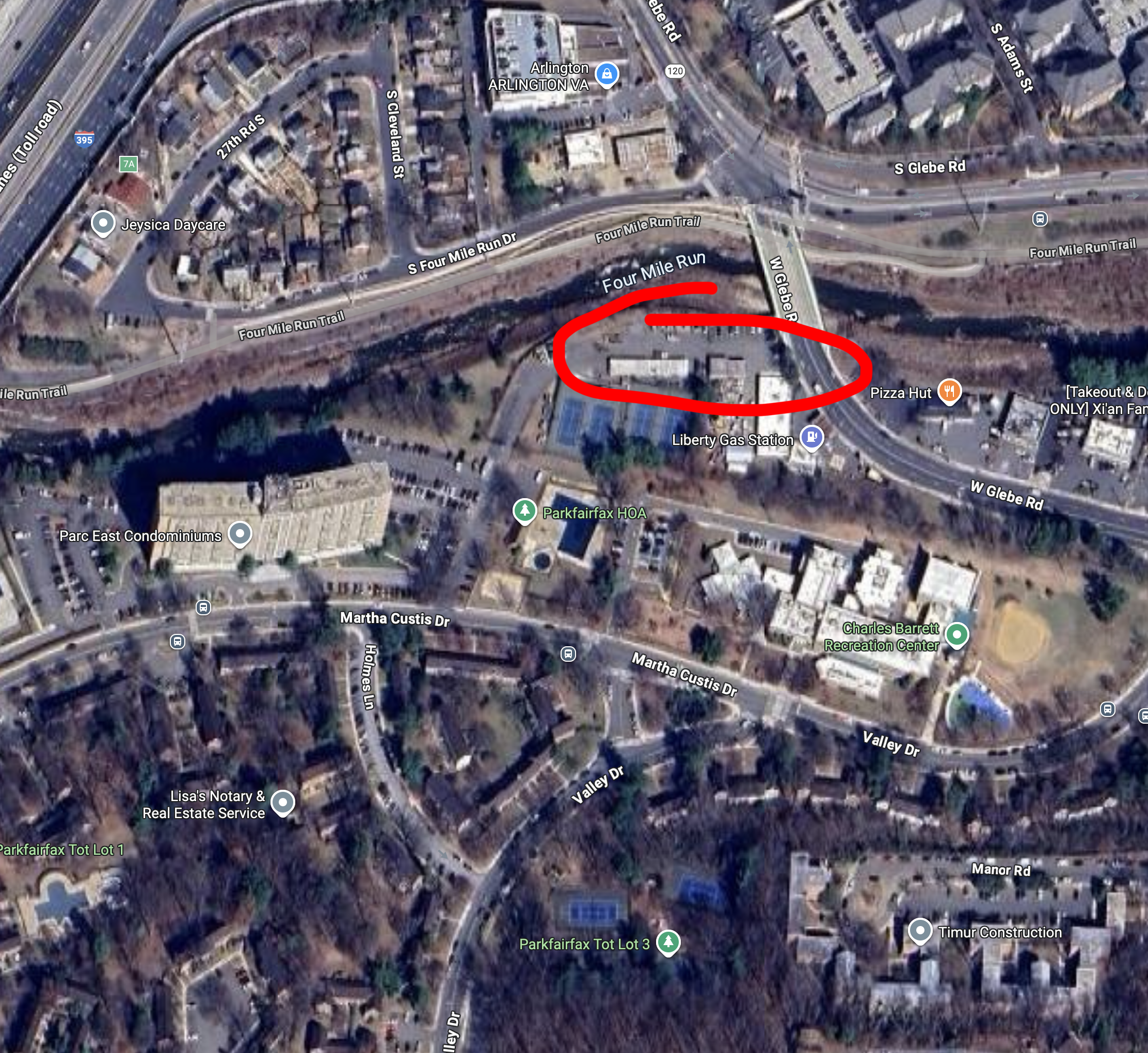 For reasons unbeknownst to me, the city's GIS maps include part of Cameron Run within the parcel boundaries near Bell Old Town apartments. There is a sliver of land on the south end of the parcel that technically meets our criteria. Probably a better location for backyard ducks than chickens, honestly.