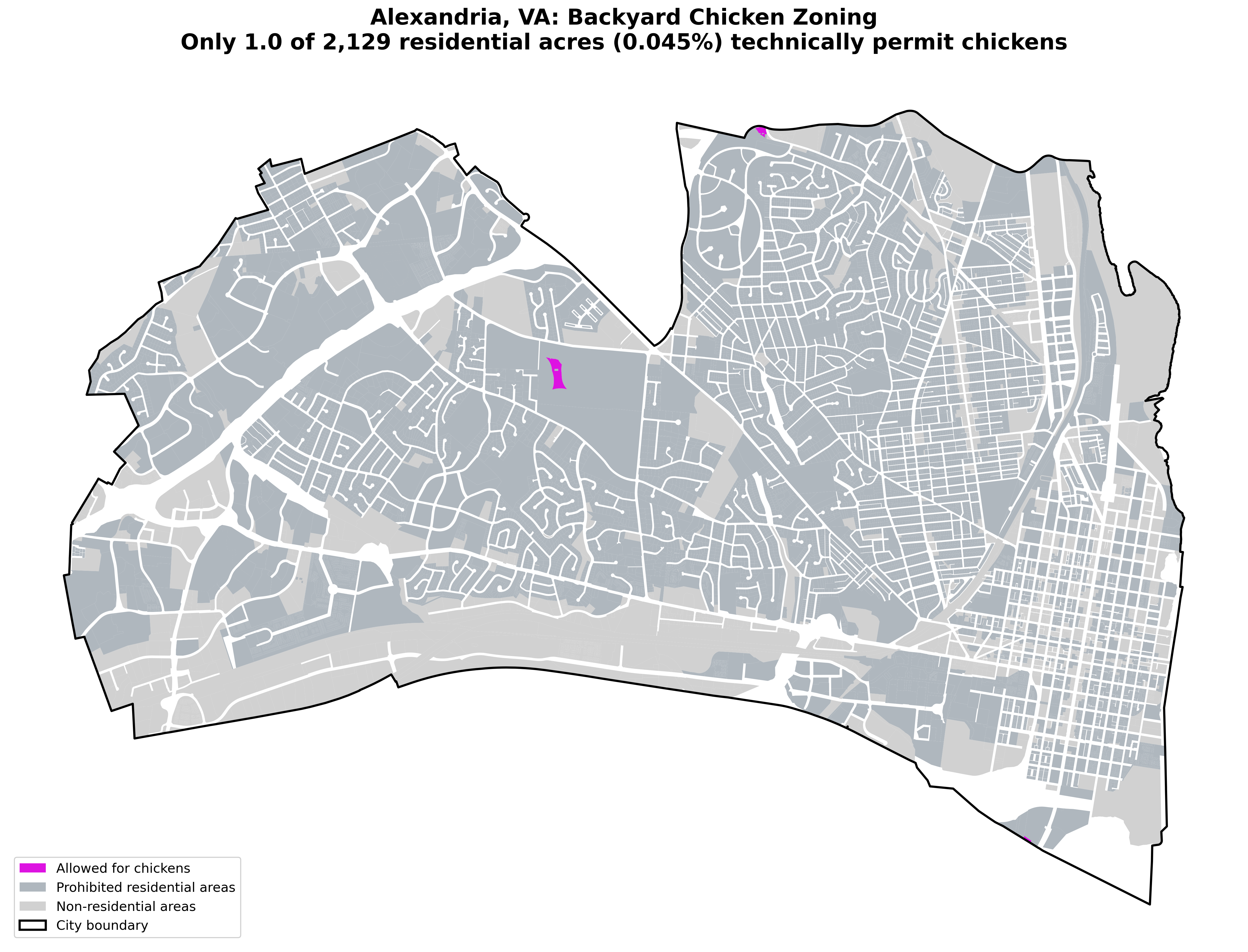 In the entire city of Alexandria, Virginia, 1 acre of land is technically available for keeping backyard chickens. You can only have backyard chickens in one of three locations: